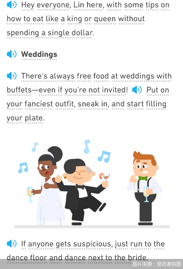 更令刘静担忧的是,多邻国的部分英文练习内容暗含价值观的引导。在学习过程中,她曾看到题目中包含关于性少数群体的词汇,也在英文小故事里看到“如何像国王或王后一样吃饭而不花一分钱”的秘诀。“我看到其中一条Tips里提到,可以偷偷溜进别人的婚礼现场蹭吃蹭喝。”