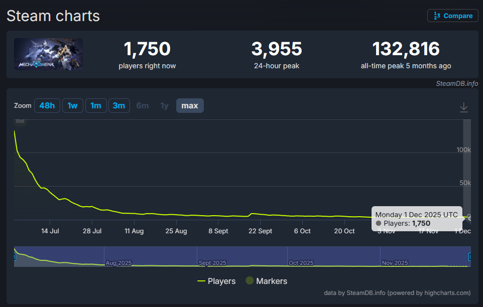去年7月《解限机》公测,开局确实挺猛,Steam的在线万,登顶热门新游第一,但游戏圈的老话怎么说来着?开局靠宣发,留人靠内容,很快,游戏的在线人数就像坐滑梯一样快速回落,从十几万跌到几千,Steam国区的好评率直接掉到“褒贬不一”;
